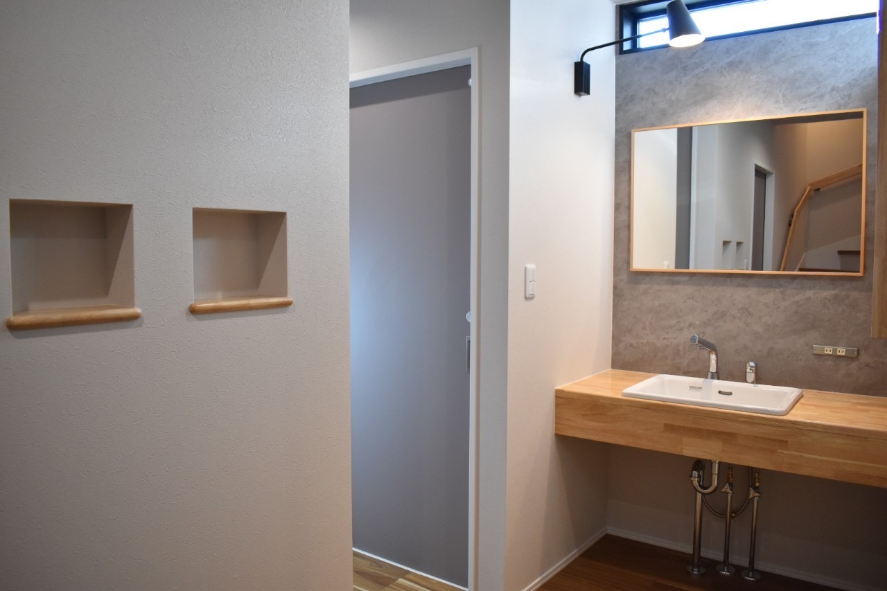 造作キッチン、造作棚、造作手洗い等、オリジナル造作家具で独自性を演出。